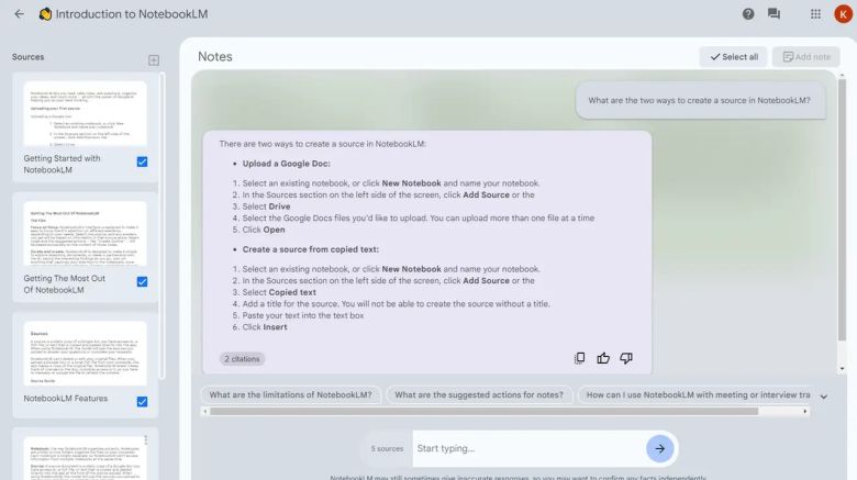 이 밖에도 선택한 소스에 노트북LM의 AI를 집중시키려면 소스 사이드바에서 특정 소스 세트를 선택해 채팅할 수 있다. 또 PDF와 복사된 텍스트도 지원한다. 텍스트를 복사해 붙여 넣어 새 소스를 만들고 제목이 생성되면 편집할 수 있다.