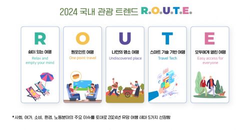 한국관광공사가 2024년 한국 관광을 이끌 새로운 트렌드로 ‘루트(R.O.U.T.E.)’를 제시했다. 관광공사는 “최근 3년간의 다양한 데이터를 종합 분석해 도출한 ‘2024 관광 트렌드’를 한국관광데이터랩에 발표했다”고 11일 밝혔다. 관광공사는 “‘루트(R.O.U.T.E.)’는 초고령화 사회 진입 및 1인 가구의 증가, 인공지능의 발달, 글로벌 정세 및 사회 전반의 거시적 변화를 반영했으며, 최근 3년간 한국관광데이터랩 내 빅데이터(이동통신, 카드소비) 및 소셜데이터 분석, 전문가 인터뷰, 국내 소비자 1000명 대상 설문조사 등 다각화된 데이터를 활용했다”고 덧붙였다.