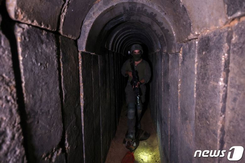 이스라엘군이 팔레스타인 무장정파 하마스의 은신처로 사용되었다면서 22일(현지시간) 알시파 병원 아래 터널을 공개했다. 무장한 이스라엘 군인이 터널 내에서 이동하고 있다. ⓒ 로이터=뉴스1 ⓒ News1 최종일 기자 |
