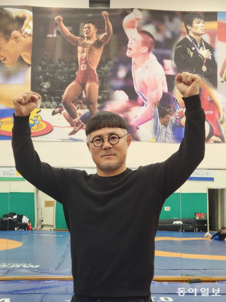 한국 레슬링의 레전드 박장순 삼성생명 감독이 경기 용인에 있는 팀 훈련장에서 뒤로 보이는 1992년 바르셀로나 올림픽 당시 장면처럼 두 팔을 벌려 보이고 있다. 용인=이헌재 기자 uni@donga.com |