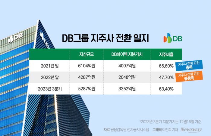 지주사 전환 통보 전 DB아이앤씨의 2021년 말 자산규모는 6104억원, DB하이텍 지분 가치는 4007억원으로 지주 비율은 65.6%에 달했다. 하지만 지난해에는 각각 4287억원, 2048억원을 기록해 지주 비율은 47.7%까지 떨어졌다. 공정거래법 기준을 충족할 경우 DB아이앤씨는 DB하이텍 지분 30% 이상을 의무적으로 확보해야 한다.