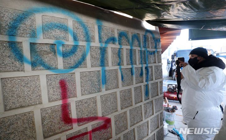 [서울=뉴시스] 배훈식 기자 = 문화재청 작업자들이 17일 오전 서울 종로구 경복궁 서편 담장에 칠해진 낙서 제거 작업을 하고 있다. (공동취재) 2023.12.17. photo@newsis.com |