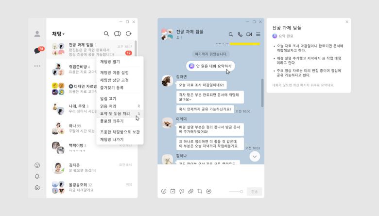 먼저 채팅 목록에서 안 읽은 대화가 있는 채팅방을 우클릭하고 '요약 및 읽음 처리'를 클릭하면 대화 내용을 요약해준다. 채팅방에서 '안 읽은 대화 요약하기' 버튼을 클릭해도 된다.