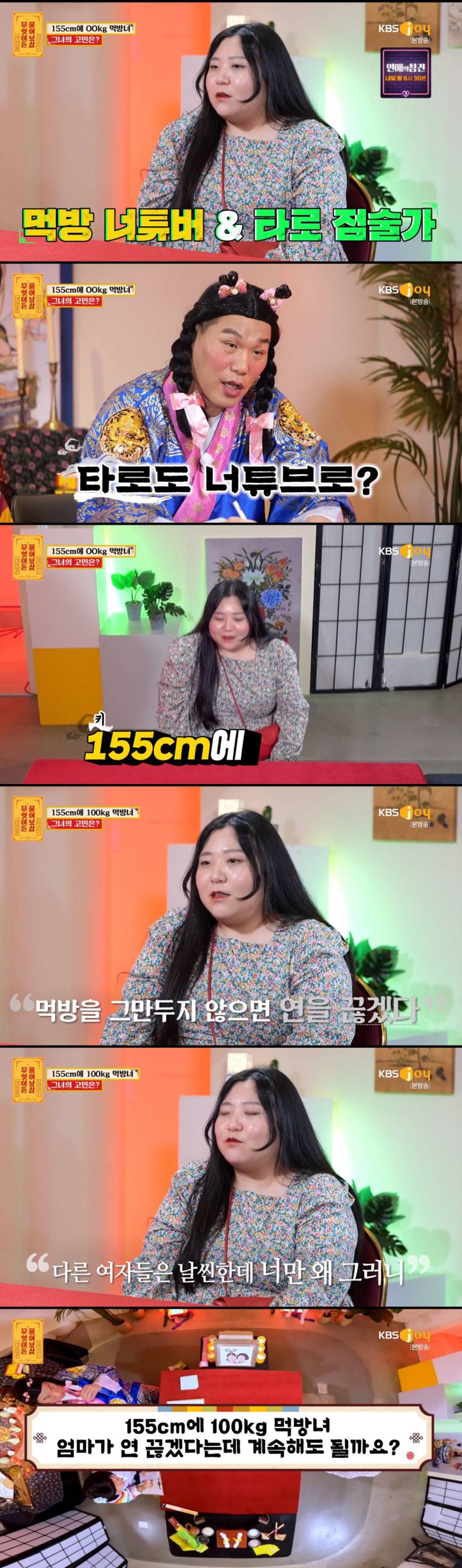 의뢰인은 "155cm에 100kg이다. 살이 쪘는데 먹는 게 너무 좋고 행복하다. 먹방을 시작했는데 엄마께서 당장 먹방을 그만두지 않으면 연을 끊겠다고 하셨다"라며 고민을 이야기했다.