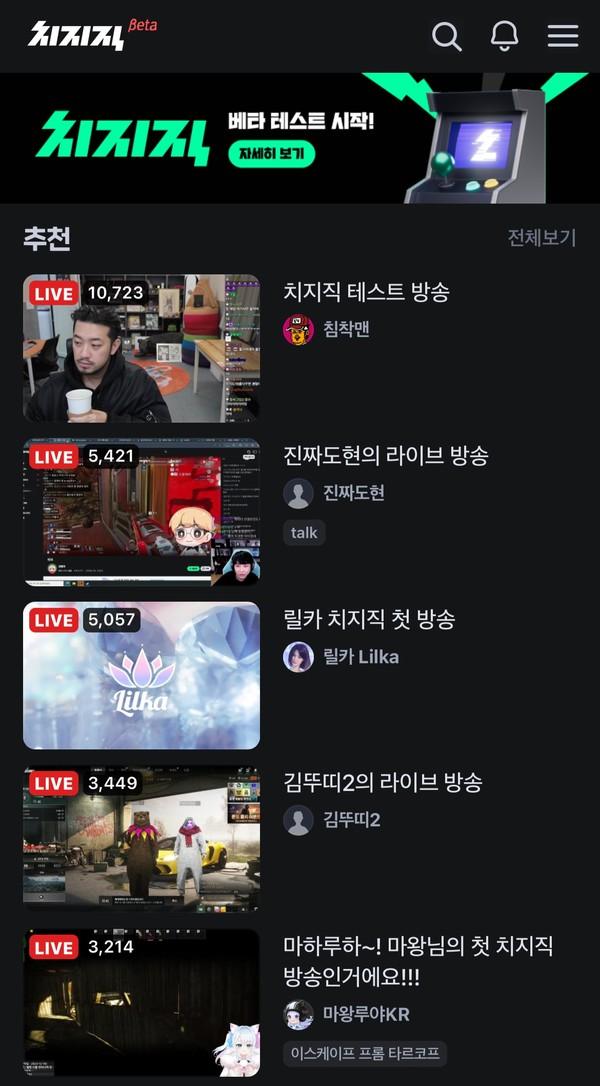 네이버는 19일 정오부터 게임 스트리밍 플랫폼 '치지직'의 베타서비스를 시작했다. 지난 5일 직원들을 대상으로 비공개 테스트를 진행한 뒤 처음으로 대중에게 플랫폼을 선보이는 자리에 웹툰작가 겸 방송인 '침착맨', 오버워치 e스포츠 선수 출신 '진짜도현', 아프리카TV에서 트위치로 이적했던 인기 스트리머 '릴카' 등이 참여하면서 실시간 시청자 수가 스트리머당 수천에서 만 단위를 아우르고 있다.