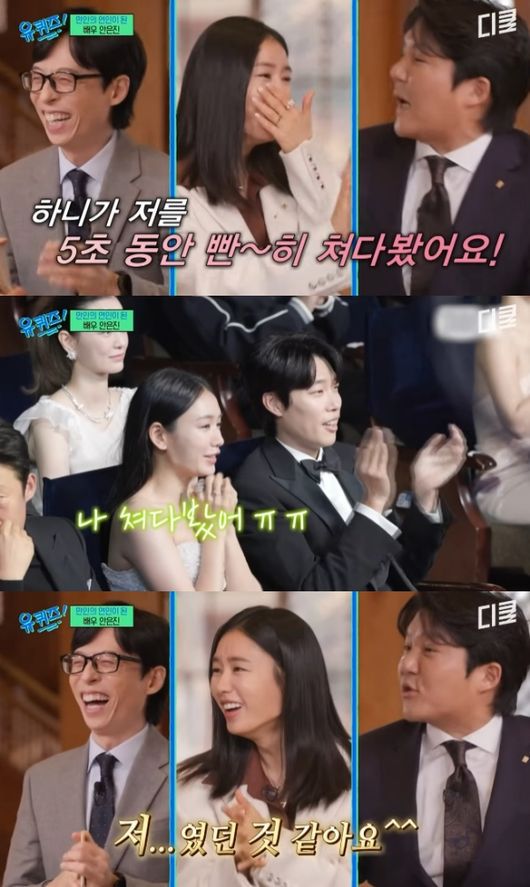 이에 유재석은 “옆에 류준열 씨 말고 또 누가 있었냐”고 물었고, 안은진은 “유해진 선배님”이라고 답했다. 그러자 유재석은 “유해진 씨를 볼 수도 있고 류준열 씨를 볼 수도 있지 않나”라고 의문을 제기했다. 하지만 안은진은 “근데 저 였던 것 같다”고 단호히 답했다. 그는 “왜냐면 되게 가까웠다. 제가 계속 산만하게 이러고 있어서 분명히 저를 봤을 것”이라고 확신했다.