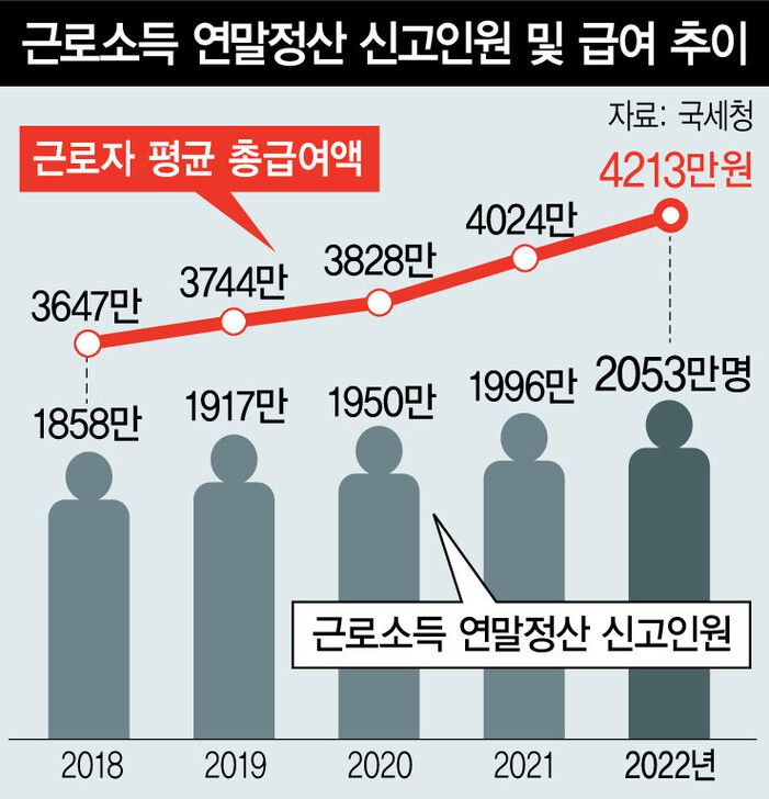 국세청이 20일 발표한 ‘2022년 국세 통계’를 보면, 지난해 귀속 근로소득 연말정산을 신고한 근로자는 2053만명으로 전년과 비교해 2.9%(57만명) 증가했다. 근로소득 신고자가 2천만명을 넘어선 건 이번이 처음이다.