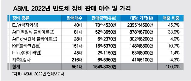 지난해 ASML의 연간보고서에 기재된 판매대수와 판매금액을 통해 계산한 EUV 장비 1대당 가격은 한화로 2400억원 정도(계측&검사 장비까지 합쳐면 3000억 정도)다. 판매대수로 가장 많이 팔리는 KrF 장비(대당 약 150억원)보다 20배 가량 비싸다.
