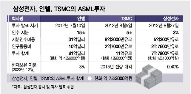 ASML은 당시 삼성전자 뿐만 아니라 전세계 반도체 1위인 인텔과 파운드리 1위 업체인 TSMC(Taiwan Semiconductor Manufacturing Company)에게도 투자를 제안했다. 약 25%의 지분 인수와 공동연구개발비를 투자해달라는 제안이었다. ASML은 여기서 조달한 약 7조 3000억원의 자금(아래 표 참조)을 7나노 이하 EUV 첨단 장비 개발을 위해 썼다.