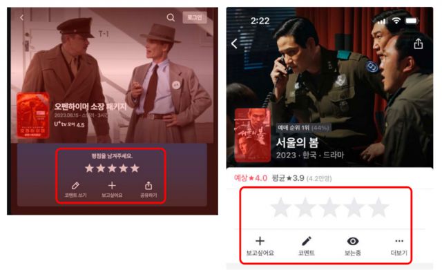 예를 들어 콘텐츠 상세페이지에는 ‘보고싶어요’와 ‘코멘트’ 기능이 각각 ‘+’와 ‘연필’ 모양 아이콘으로 제시돼 있는데, U+tv모아도 같은 아이콘으로 ‘보고싶어요’와 ‘코멘트 쓰기’ 기능이 있다. 별점을 매기는 사용자환경(UI)도 비슷할 뿐만 아니라, 코멘트를 쓰는 페이지에서는 ‘스포일러 포함’ 기능도 똑같이 있다.