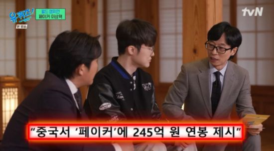 이날 유재석은 "중국에서 245억 연봉 제의가 들어왔는데, 팀에 남기 위해서 거절한 거냐"라고 물었다. 이에 페이커는 "여러 가지 조건을 다 보긴 하는데, 제 목표가 돈이나 명예보다는 더 배우고 성장하는 것에 초점을 뒀다. 팀에서도 좋은 대우를 해준다"라며 겸손한 모습을 보였다.