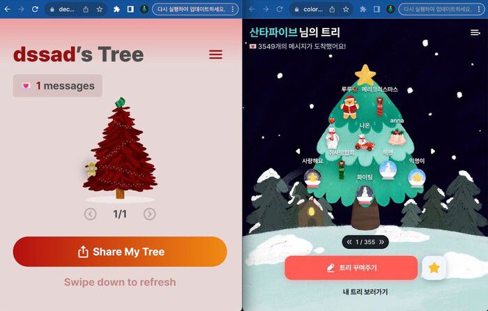 산타파이브의 ‘내 트리를 꾸며줘’ 웹서비스(오른쪽)와 거의 흡사한 언박서즈의 ‘데코마이트리’ 서비스 화면 갈무리. 산타파이브 제공