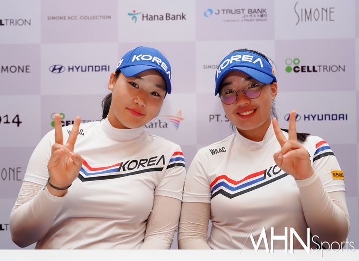 국가대표 김민솔과 이효송이 21일 인도네시아 자카르타 폰독인다 GC(파72ㅣ6,906야드)에서 사단법인 아시안 골프 리더스 포럼(AGLF)이 주관하는 '시몬느 아시아퍼시픽컵 2023'(총상금75만 달러ㅣ단체전 20만 달러ㅣ개인전 55만 달러) 1라운드 경기를 마친 후 포즈를 취하고 있다.
