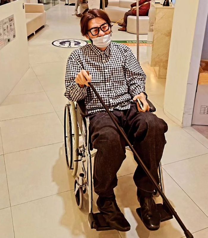 사진 속 노홍철은 병원에서 휠체어에 탄 채 지팡이를 들고 있다. 커다란 안경 너머 미소인지 찡그린 건지 모를 표정이 안쓰러움을 더한다.