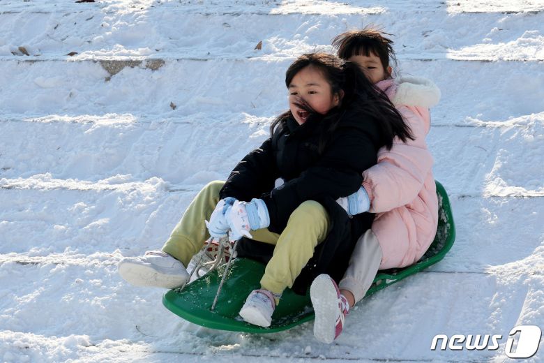 24일 오후 서울 뚝섬한강공원 눈썰매장을 찾은 어린이가 썰매를 타고 있다. 2023.12.24/뉴스1 ⓒ News1 장수영 기자