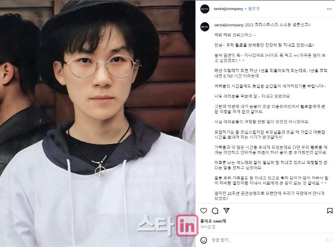 서태지는 지난 24일 자신의 인스타그램을 통해 “벌써 1년이 휙 지나갔다. 나이도 훅 먹었다”며 “2023년을 쭉 돌아보니 비교적 소소한 일상만 있었던 것 같다”고 팬들에게 인사말을 전했다.