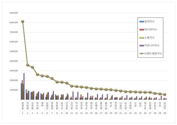 트로트 가수 브랜드평판 1위를 기록한 임영웅 브랜드는 참여지수 1,700,162 미디어지수 2,013,667 소통지수 1,653,634 커뮤니티지수 2,759,288이 되면서 브랜드평판지수 8,126,751로 분석됐다. 지난 11월 브랜드평판지수 7,412,728과 비교해보면 9.63% 상승했다.​​
