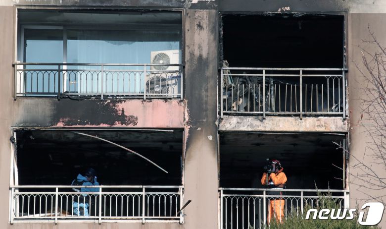 26일 오전 서울 도봉구의 한 아파트 화재현장에서 경찰과 소방 등 관계당국으로 구성된 합동감식팀이 감식을 하고 있다. 2023.12.26/뉴스1 ⓒ News1 이승배 기자 |