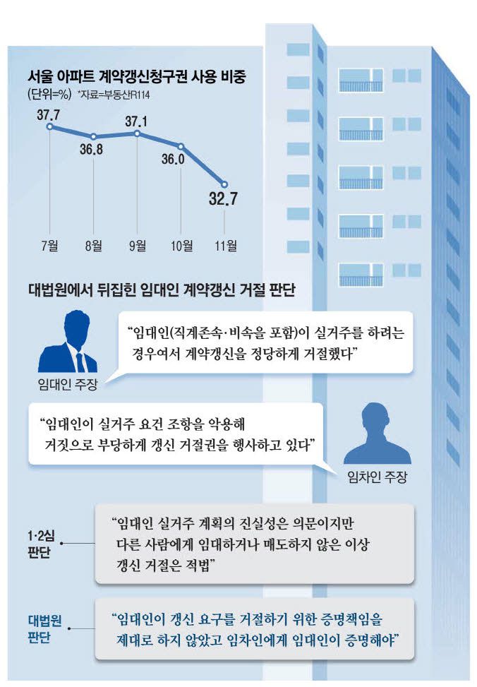 대법원 판결은 임대인이 실거주를 한다는 이유로 임차인의 계약갱신을 거절할 때 '실거주 의사'에 대한 증명을 임대인에게 부여했다는 점에서 부동산 업계에 파장이 예상된다. 그동안 임대인이 "실거주를 하겠다"는 이유로 계약갱신을 거절할 때 '임대인의 실거주 의무'에 대한 입증을 놓고 갈등이 많았다.
