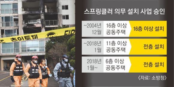 불이 난 아파트는 완공될 당시인 2001년 소방법에 따라 16층부터만 스프링클러가 설치돼 불길이 크게 번진 것으로 파악됐다. 직방 빅데이터 통계에 따르면 1962년부터 2004년까지 준공된 30가구 이상 아파트는 593만 가구로 집계됐다. 이 아파트와 마찬가지로 예전 소방법을 적용받는 593만 가구 중 15층 이하 가구는 스프링클러가 설치되지 않았을 가능성이 크다. 함영진 직방 빅데이터랩장은 “정비 사업 이후 통계에 멸실이 일부 잡혔을 수 있지만 준공을 기준으로 소방법 적용을 받지 않는 아파트가 이 정도로 추정된다”고 말했다.