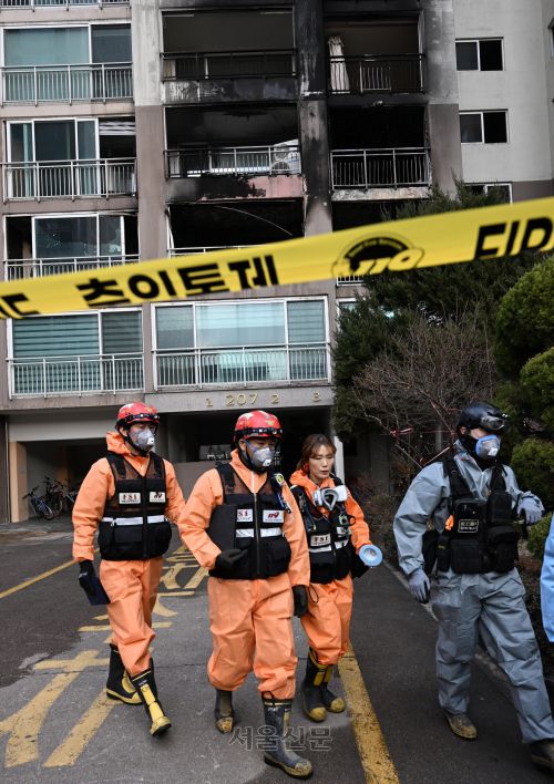 서울 도봉구 아파트 화재 현장에서 26일 경찰과 소방 관계자가 합동감식을 위해 이동하고 있다. 도준석 기자 |