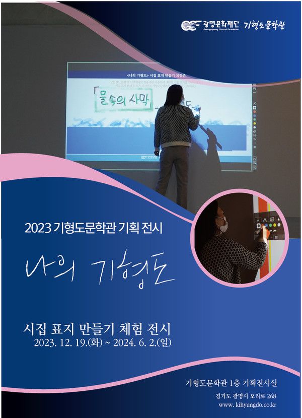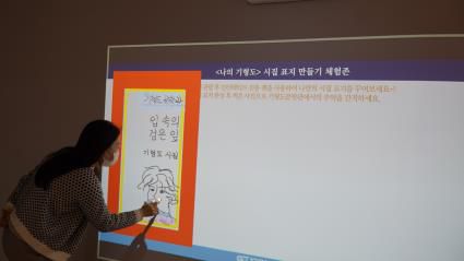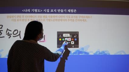 관람객은 상설전시실에서 다양한 시를 관람 후 인터랙티브 빔프로젝터 전용 펜을 사용하여 100인치 화면에 나만의 기형도 시집 표지를 만드는 체험을 할 수 있습니다.