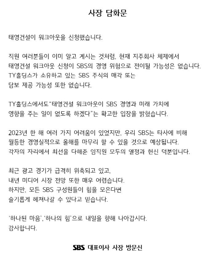 방문신 SBS 대표이사는 이날 저녁 사장 담화문을 통해 “태영건설 워크아웃 신청이 SBS의 경영 위험으로 전이될 가능성은 없다”며 “티와이홀딩스(TY홀딩스)가 소유한 SBS 주식의 매각 또는 담보 제공 가능성 또한 없다”고 밝혔다.