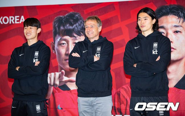 [OSEN=민경훈 기자] 28일 오전 서울CGV 용산아이파크몰에서 축구대표팀 아시안컵 최종명단 발표 기자회견이 진행됐다. 대표팀 위르겐 클린스만 감독과 이재성, 조규성이 포토타임을 갖고 있다. 2023.12.28 / rumi@osen.co.kr |