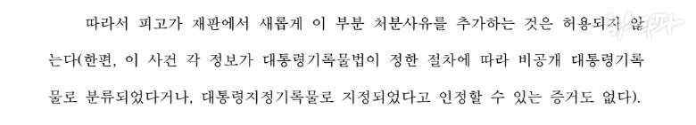 하지만 1심 재판부는 대통령실의 처분 사유 추가 요구를 받아들이지 않았다. 대통령실이 최초에 직원 명단 비공개 사유로 댔던 정보공개법 9조 1항 5·6호만 판결 대상에 포함해야 한다고 판단했다. 그러면서 재판부는 "대통령실 직원 명단이 대통령기록물법이 정한 절차에 따라 비공개 대통령기록물로 분류됐다거나, 대통령지정기록물로 지정됐다고 인정할 수 있는 증거가 없다"고도 첨언했다. 결국 '정보공개법 9조 1항 1호'는 1심 판결에 아무런 영향을 미치지 못했다. 아래는 판결문 내용 중 해당 부분.