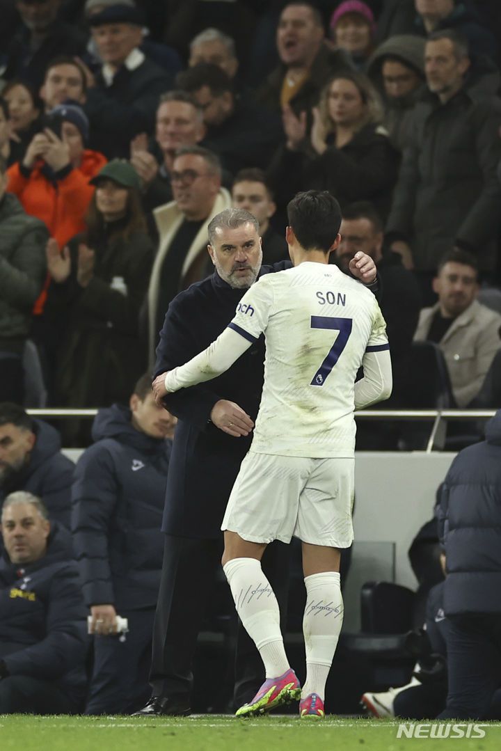 [런던=AP/뉴시스] 잉글랜드 프로축구 프리미어리그(EPL) 토트넘홋스퍼의 엔제 포스테코글루 감독과 '주장' 손흥민. 2023.12.11. |