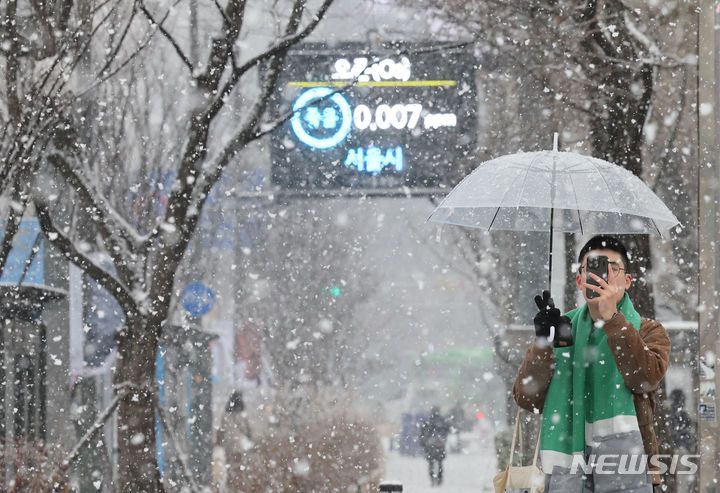 [서울=뉴시스] 김근수 기자 = 서울지역에 대설주의보가 내려진 30일 서울 종로구 세종대로 일대에서 한 시민이 휴대전화에 내리는 눈을 담고 있다. 2023.12.30. ks@newsis.com