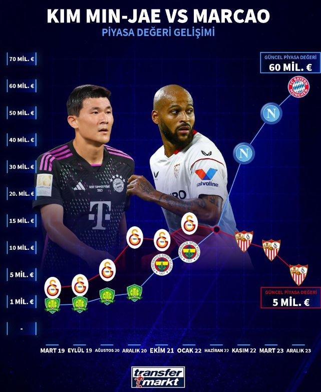 매체의 SNS에 공개된 자료에 따르면 김민재의 몸값은 그가 지난 2022년 페네르바흐체를 떠난 뒤 '천정부지'로 솟았다. 반면 마르캉은 같은 시기 유럽 빅리그에 도전하기 위해 스페인 라리가 세비야에 합류했으나 몸값은 더욱 떨어졌다.