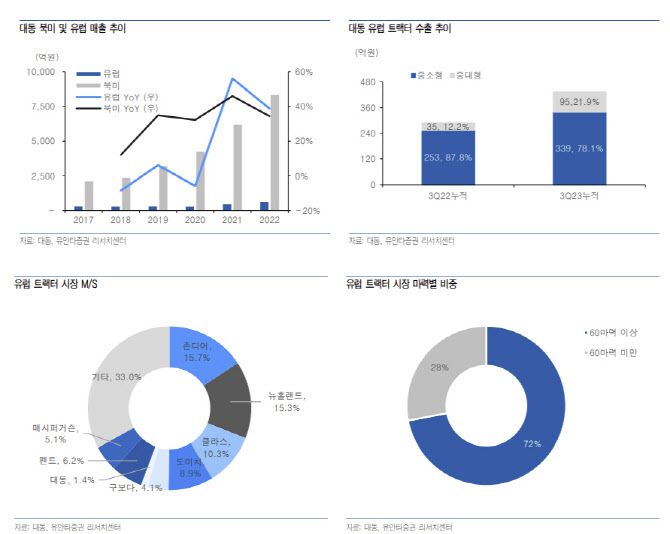 손 연구원은 “유럽은 중대형 트랙터 비중이 72%인 시장”이라며 “중대형 트랙터로의 중심축 변화는 ASP 상향과 더불어 매출 및 수익성으로 이어질 전망이며 지난해 12월에 공시한 튀르키예 3500억원 규모 트랙터 공급계약은 유럽 매출의 외형성장을 견인할 것”으로 예상했다.