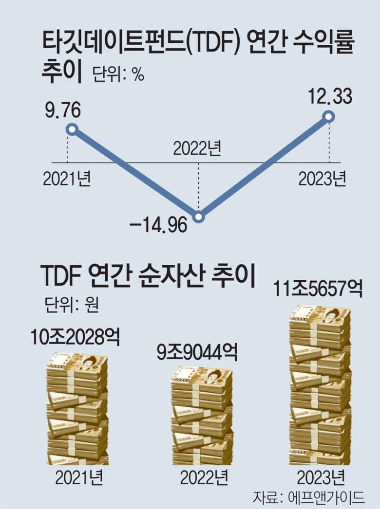 지난해 퇴직연금 시장에서 TDF에 대한 호응이 없었던 건 증시 부진이 이어지면서 수익률이 저조했던 탓이다. 최근 수익률이 7%대로 올라서긴 했지만 지난해 10월 4일 기준 TDF 평균 수익률은 ―2.28%였다. 한 금융투자업계 관계자는 “당장 수익률이 저조하다는 이유로 가입한 지 얼마 안 된 TDF를 중도 해지하는 것은 퇴직연금 상품에 대한 이해도가 부족하기 때문”이라고 지적했다.