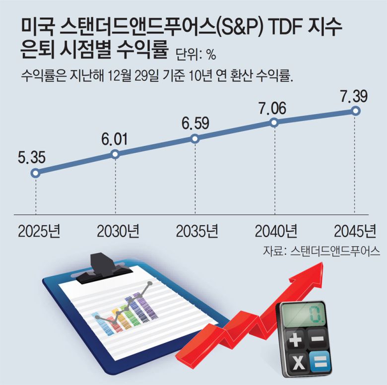 앞서 1994년 TDF를 도입한 미국에선 확정기여형(DC) 퇴직연금인 ‘401(K)’ 자산에서 TDF가 차지하는 비중이 2007년 7.5%에서 2020년 31.0%까지 커졌다. 그만큼 우수한 운용 성과가 입증된 셈이다. 미국 스탠더드앤드푸어스(S&P) TDF 지수의 지난해 말 기준 10년 연 환산 수익률은 2030년 은퇴 시점의 경우 6.01%, 2045년 은퇴 시점은 7.39%에 달한다.