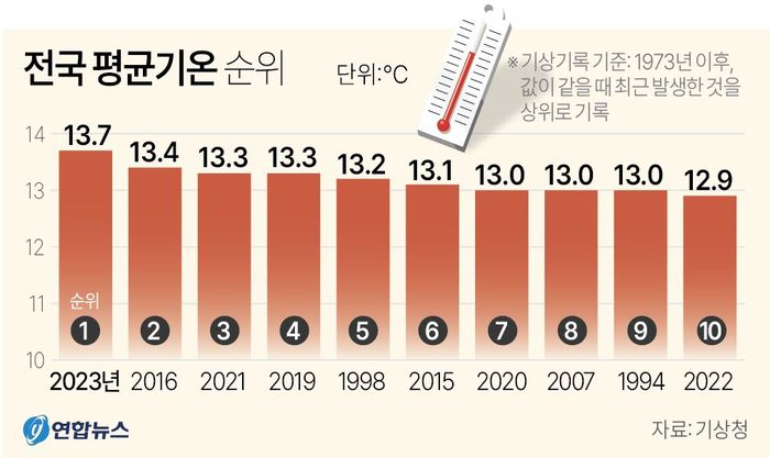 역대 연평균기온 3위는 2021년(13.3도), 4위는 2019년(13.3도), 6위는 2015년(13.1도), 7위는 2020년(13.0도), 8위는 2007년(13.0도), 10위는 2022년(12.9도)이다. 역대 1~10위 중 5위(1998년·13.2도)와 9위(1994년·13.0도)를 제외하면 모두 21세기다. 기후변화가 갈수록 심해지고 있음을 의미한다.