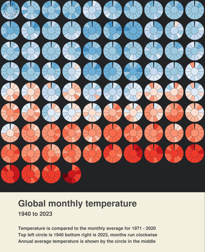 1940년부터 2023년 사이의 전 지구 월 평균기온을 시각화한 그래프. 맨 위 가장 왼쪽의 원은 1940년, 맨 아래 가장 오른쪽의 2023년의 월 평균기온을 의미한다. 원마다 모두 12개로 나뉜 각각의 구역이 1~12월 사이의 월 평균기온으로, 진한 빨간색일수록 평균기온이 높았음을 의미한다. 자료 : 유럽우주국(ESA) |