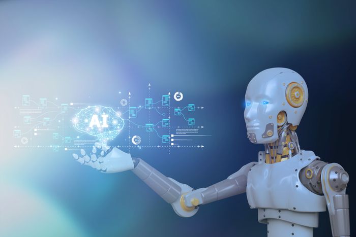 Hand of robot holding modern interface and AI brain (Artificial intelligence), Connection technology and new era of innovation, Machine learning, AI, Technology and science. |