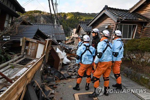 강진에 무너진 가옥 살피는 일본 소방관들(와지마 AFP=연합뉴스) 일본 소방관들이 2일 이시카와현 와지마시에서 지진으로 무너진 목조 가옥들을 점검하고 있다. 새해 첫날 이시카와현 노토반도에서 발생한 규모 7.6의 강진으로 3일 0시 기준 57명이 숨진 것으로 집계됐다. 2024.01.03 besthope@yna.co.kr