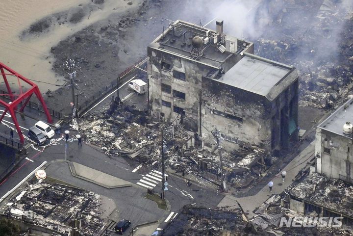 [와지마=AP/뉴시스] 3일 일본 이시카와현 와지마의 지진으로 타버린 건물에서 연기가 피어오르고 있다. 지난 1일 이시카와현 노토반도에서 발생한 지진으로 지금까지 사망자 숫자는 최소 62명으로 늘어났다. 2024.01.03. |