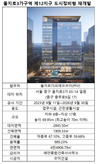 이 사업은 서울 중구 을지로3가구역 제12지구 도시정비형 재개발로 진행되고 있으며, 작년 9월 착공했다. 시행사는 을지로75피에프브이(PFV), 시공사는 우미건설이다.
