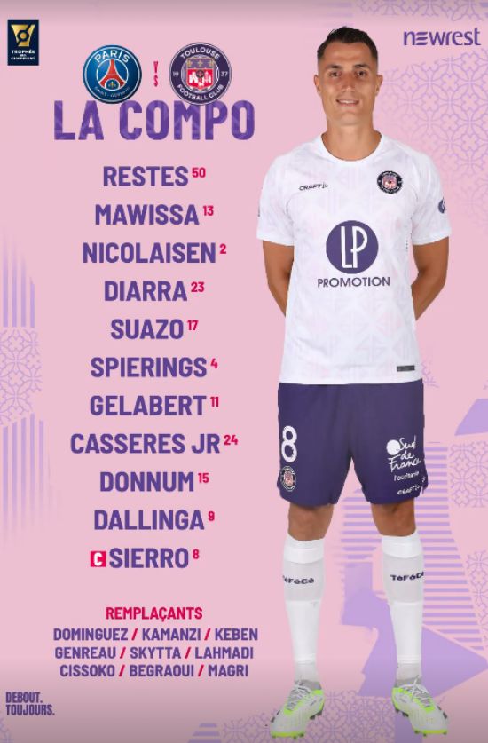 툴루즈는 4-3-3 전형으로 맞섰다. 기욤 헤스테스 골키퍼를 비롯해 가브리엘 수아소,라스무스 니콜라이센, 무사 디아라, 크리스티앙 마비사 엘레비가 수비를 구성했다. 중원은 크리스티안 카세레스 주니어, 스타인 스피어링스, 빈센트 시에로가 지켰다. 최전방에 세자르 겔라베르트, 아론 된눔, 타이스 달링가가 출격했다.