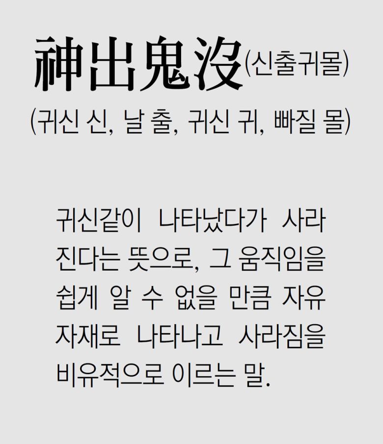 ● 생각거리: 당희장어(唐戱場語)의 “두 머리에 세 얼굴의 귀신이 나타났다가 귀신처럼 사라졌다(兩頭三面 神出鬼沒)”에서도 유래를 찾을 수 있는데 자유자재로 나타났다가 사라져 쉽사리 그 실체를 파악할 수 없다는 뜻이지요. 예를 들어 “그 회사의 기술 혁신은 신출귀몰하여 경쟁 업체들이 따라잡기 힘들다”와 같이 사용할 수 있습니다.