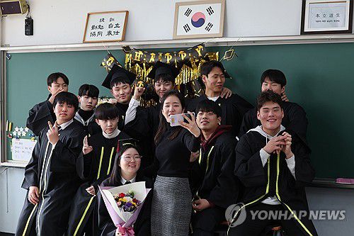 (서울=연합뉴스) 임화영 기자 = 올해 폐교를 앞둔 서울 성동구 덕수고등학교에서 열린 졸업식에서 마지막 졸업생들이 5일 선생님과 함께 기념촬영하고 있다.