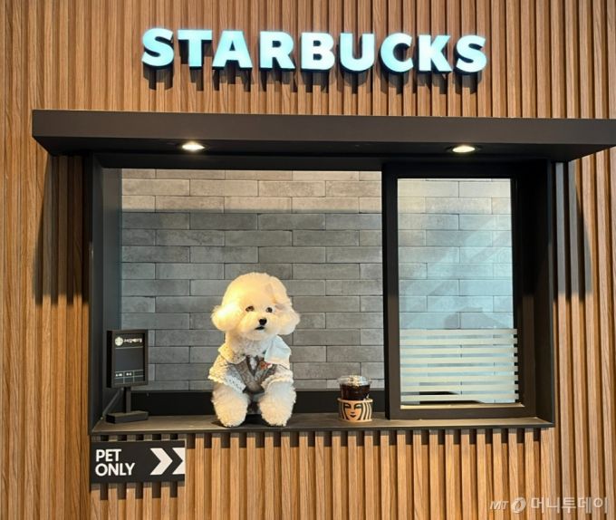 5일 경기 구리시의 스타벅스 구리갈매DT점 내 포토존에서 강아지가 사진 촬영을 하고 있다./사진=유예림 기자 |