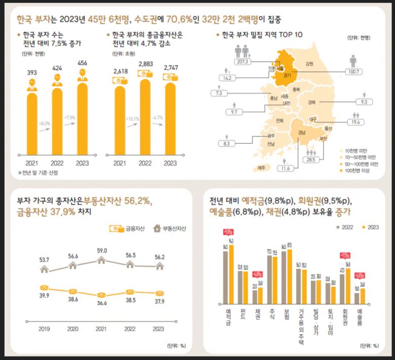 한국 부자의 자산은 평균적으로 부동산과 금융자산에 각각 56.2%, 37.9%의 비율로 나뉘어 있었다. 2022년(부동산 56.5%·금융 38.5%)과 비교해 부동산 비중이 소폭 줄었다.