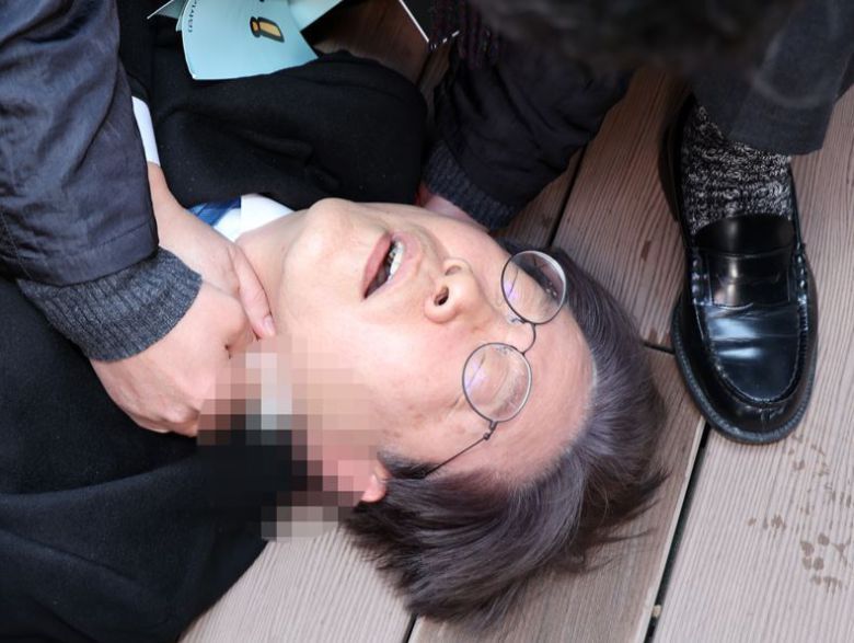 지난 2일, 부산 가덕도 신공항 건설부지 방문 도중 60대 남성 김모씨로부터 피습당한 후 바닥에 쓰러져 있는 이재명 더불어민주당 대표 ⓒ뉴시스 |