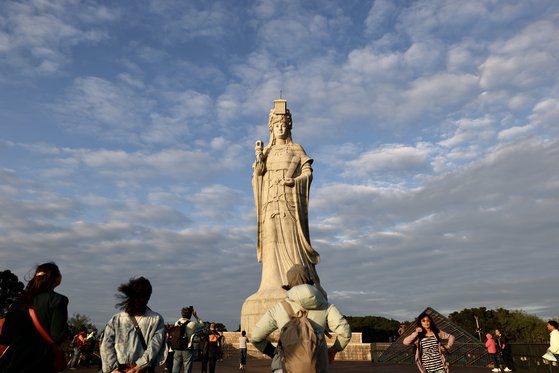 지난해 10월 대만 마츠섬에 있는 바다의 여신 '마조'의 거대한 동상 옆을 사람들이 걷고 있다. 마조는 대만인들의 구심점으로 불리며 대만의 중요한 종교 문화로 꼽힌다. EPA=연합뉴스 |