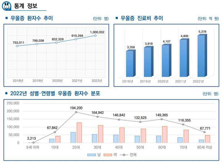 10일 건강보험심사평가원 '생활 속 질병·진료행위 통계'에 따르면 2022년 기준 우울증으로 진료를 받은 환자는 100만32명이다. 연간 우울증 진료 환자 수가 100만 명을 넘은 건 이번이 처음이다.