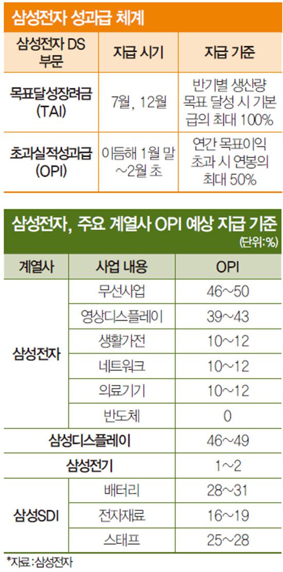 삼성그룹의 직원 성과급을 좌우하는 OPI(Overall Performance Incen tive·초과이익성과급) 예상 지급 범위가 공개되며 뒷말이 무성하다. 삼성전자와 타 계열사 간, 또 삼성전자 내부 사업부별로 성과급 기준이 흔들리는 것 아니냐는 불만의 목소리도 나온다.